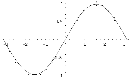 Example 2. This example shows the possibility of fitting of experimental data with dispersion. For instance there are two points with the same abscise equal to -2.5132 in this example. The corresponding values of function are -0.55777 and -0.61777. The mean value is -0.58777, which exactly corresponds to the value in the previous example. There are also several similar points at x= -1.57075; -0.6283; 0.6283; 1.57075; 2.5132.