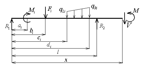 Note that in the above formulas only those members that correspond to the load components located to the left side of the considered cross section with coordinate x should be taken into account: values of ai, bi, ci, di, l must be less than x. Formulas can be simplified in the case of uniformly distributed load discarding members with factors (qRi- qLi), which are equal to 0. |