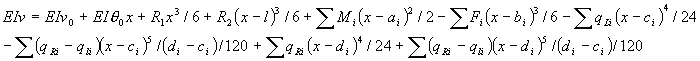 | where v0 and θ0 are deflection and slope of the deflection curve at x=0 respectively. In the case of beam with the pin support at the left end v0 is equal to 0. The value of EIθ0 we obtain from the condition v(l)=0. |