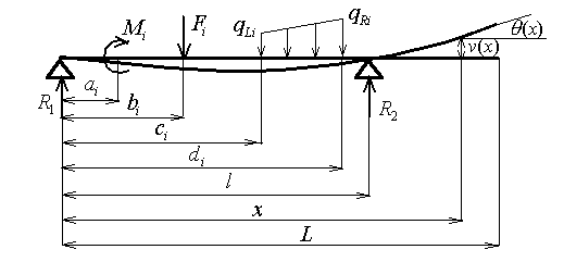 deflections of simply supported beam with or without overhang, at the first step one has to enter the length of the beam L, distance between pin supports l (the left support should be located at the left end of the beam), number of couples (external moments), concentrated and distributed loads, which are applied to the beam and submit these data. At the next steps user has to enter characteristics of each load: the values Mi and coordinates ai of the external moments, the values Fi and coordinates bi of the concentrated loads, left qLi and right qRi values of the linearly distributed loads and corresponding left ci and right di coordinates of the distributed loads. User should submit these data for each i-th load. For the uniform distributed load assume qLi=qRi, for the beam without overhang L=l.