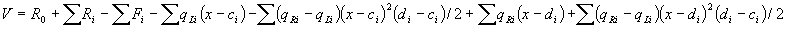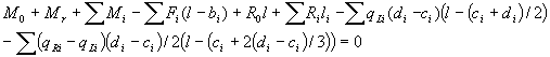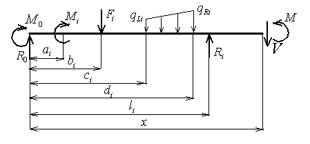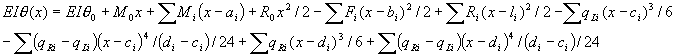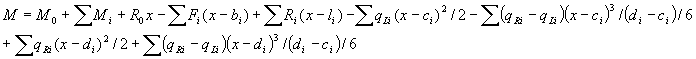 Note that in the above formulas only those members that correspond to the load components located to the left side of the considered cross section with coordinate x should be taken into account: values of ai, bi, ci, di, li must be less than x. Formulas can be simplified in the case of uniformly distributed load discarding members with factors (qRi- qLi), which are equal to 0. |