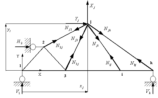 | Coordinate system has an origin on the left side and at the bottom of the truss (Fig. 1). The joint with number 1 is located at the origin of the coordinate system. Other joints have nonnegative coordinates. Vertical and horizontal components of reactions and external forces are considered as positive if they act toward the positive directions of corresponding coordinate axes. Internal forces of tension are considered as positive, but compressive forces are negative. For notation of vertical components of reactions and external forces we use letters V and Y respectively with the subscript corresponding to the number of joint where the force is applied. For horizontal components we use letters H and X. The internal force in a truss member is notated as Njk, where j and k are numbers of end joints of the truss member. |