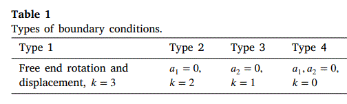 | In this case the assumption of classical theory that the axial load is uniformly distributed in circumferential direction along the edge of the cylinder is not valid for post-buckling stage. In our model the load is applied through rigid plates A (Fig. 1). Parameters a1 and a2 describe buckling translational motion and rotation of element A respectively. According to this approach, several types of boundary conditions (types of loading) were considered (see Table). Type 1 corresponded to free parallel displacement and rotation of the rigid elements. In this case two parameters a1 and a2 were defined in the model by equilibrium of elements A. The second type was characterized by rotation only, but parallel displacement of elements A was restricted. In the third type the rotation was restricted (a2= 0). Finally, a1= 0 and a2 = 0 in the fourth type, which is the case of pure rigid loading without rotation. The values 3, 2, 1, 0 of integer k (used in our model) are assigned to each loading type. The most practically important is Type 1. |
