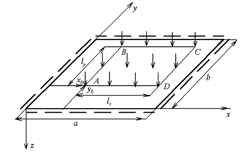 | Figure 1. Simply supported plate under transverse load q uniformly distributed on the rectangular area ABCD. |