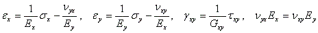 User has to enter the moduli of elasticity Ex and Ey of the material in x-axis and y-axis directions, shear modulus Gxy , as well as Poisson’s ratio νyx. The second Poisson’s ratio is calculated using formula νxy=νyxEx / Ey. We also check the restriction νxyνyx < 1 for orthotropic material and 0≤ νxy ≤ 0.5 for isotropic material before the calculation. In the case of isotropic material the field for shear modulus can be left blank. Corresponding value will be calculated by formula Gxy=Ex /(1+ νyx)/2 .