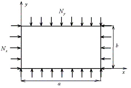 User has to enter the moduli of elasticity Ex and Ey of the material in x-axis and y-axis directions, shear modulus Gxy , as well as Poisson’s ratio νyx. The second Poisson’s ratio is calculated using formula νxy=νyxEx / Ey. We also check the restriction νxyνyx < 1 for orthotropic material and 0≤ νxy ≤ 0.5 for isotropic material before the calculation. In the case of isotropic material the field for shear modulus can be left blank. Corresponding value will be calculated by formula Gxy=Ex /(1+ νyx)/2 .