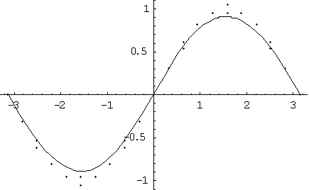 Example 2. This example shows the possibility of fitting of experimental data with dispersion. For instance there are two points with the same abscise equal to -2.5132 in this example. The corresponding values of function are -0.55777 and -0.61777. The mean value is -0.58777, which exactly corresponds to the value in the previous example. There are also several similar points at x= -1.57075; -0.6283; 0.6283; 1.57075; 2.5132.